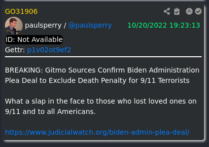[112]Paul Sperry: Gitmo Sources Confirm Biden Administration Plea Deal to Exclude Death Penalty for 9/11 Terrorists, Cheney, Bush, Rumsfeld must be relieved media link