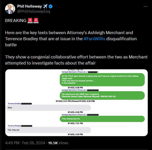 [054]Key texts between Attorney's Ashleigh Merchant and Terrence Bradley in the Fani Willis disqualification battle media link media link