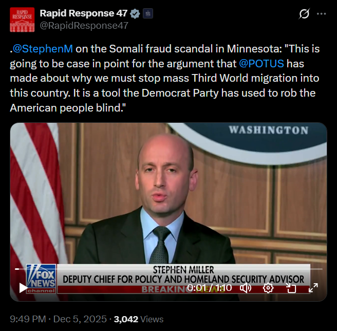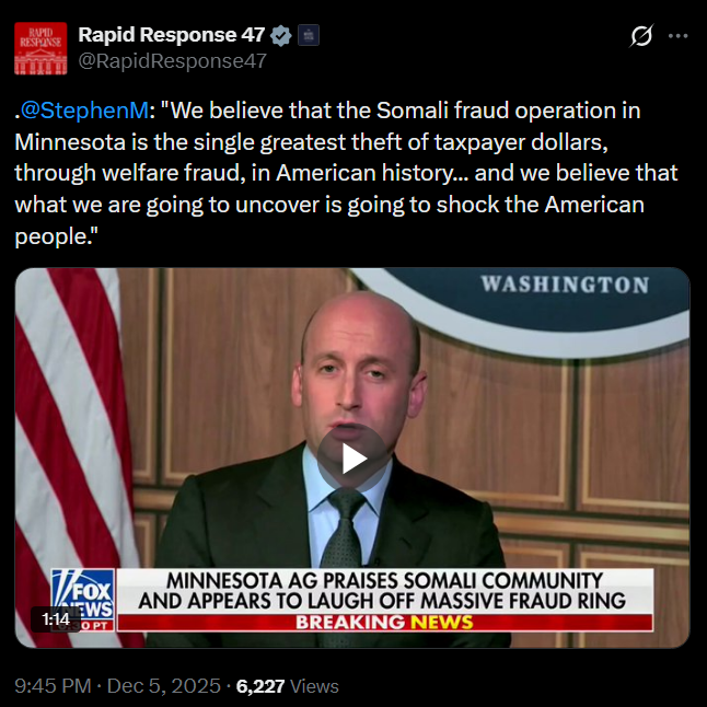 [081]@StephenM: "We believe that the Somali fraud operation in Minnesota is the single greatest theft of taxpayer dollars, through welfare fraud, in American history media link media link media link media link