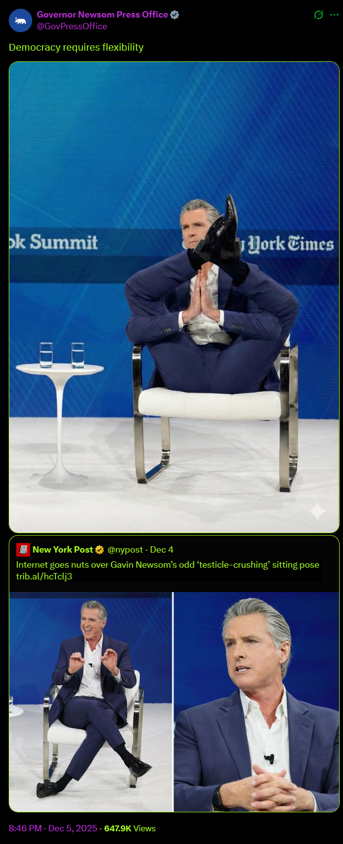 [085]Internet goes nuts over Gavin Newsom’s odd ‘testicle-crushing’ sitting pose media link media link media link