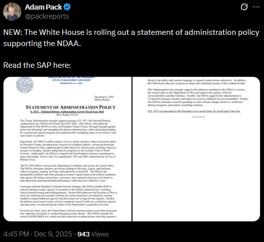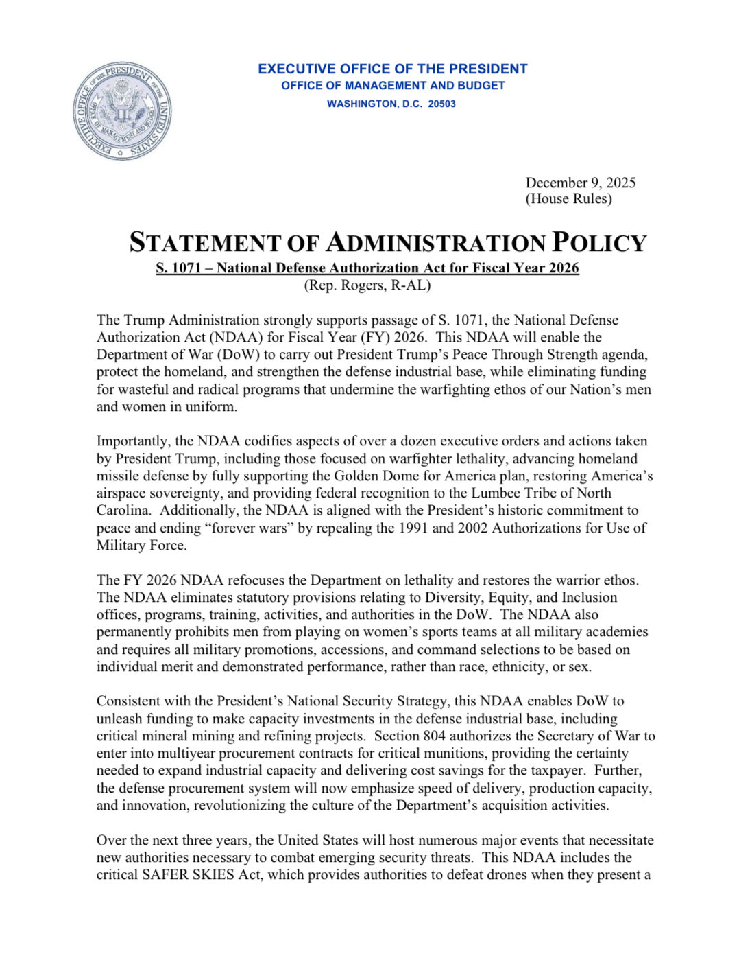 [071]NEW: The White House is rolling out a statement of administration policy supporting the NDAA media link media link media link