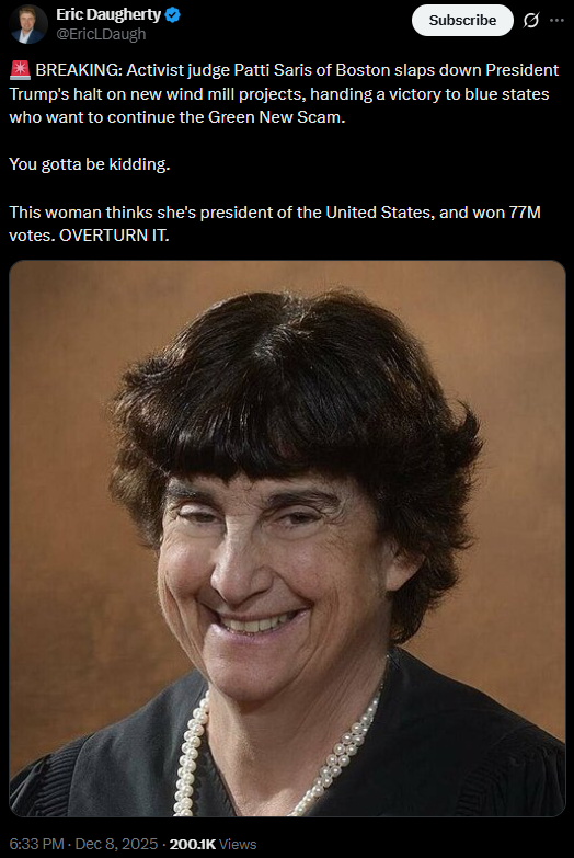 [006]Corrupt Activist judge Patti Saris of Boston halts President Trump's new wind mill projects media link media link