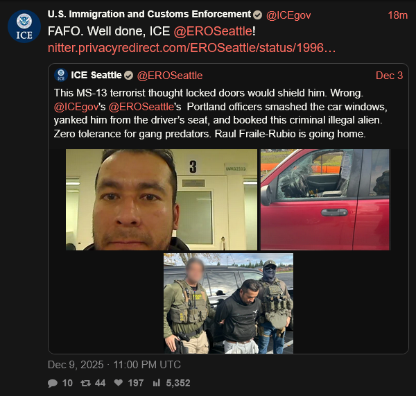 [072]@ICEgov FAFO. Well done, ICE @EROSeattle - MS-13 Terrorist Raul Fraile-Rubio is going home media link media link