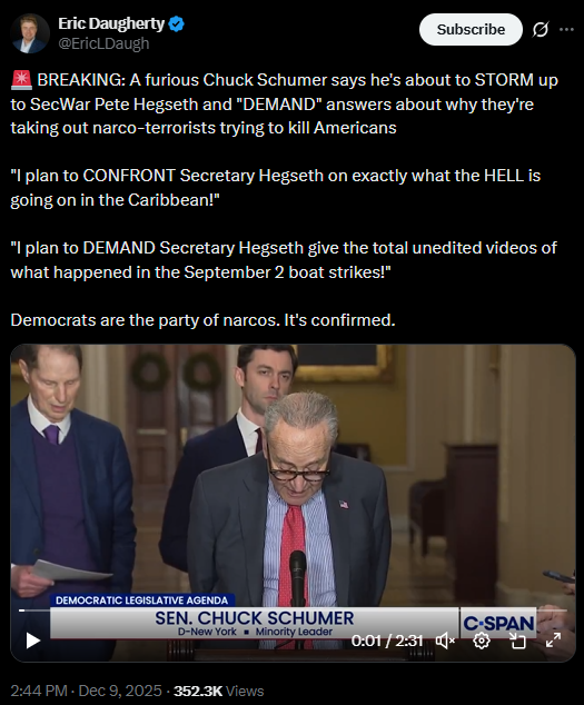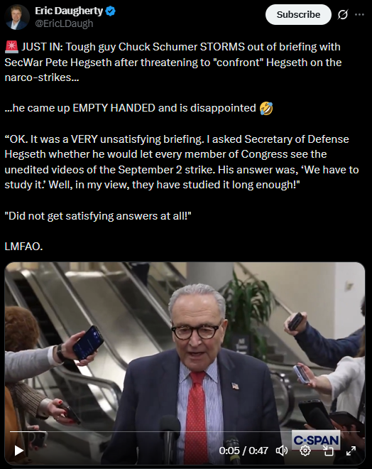 [073]Tough guy Chuck Schumer STORMS out of briefing with SecWar Pete Hegseth after threatening to "confront" media link media link media link