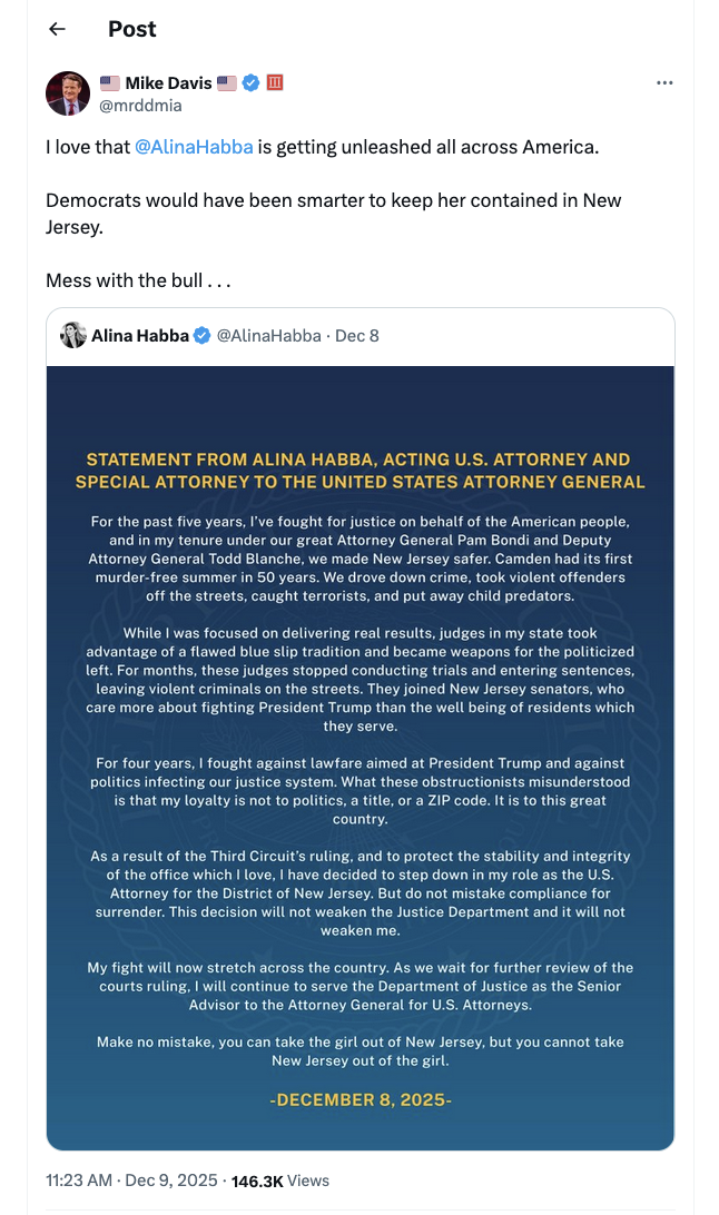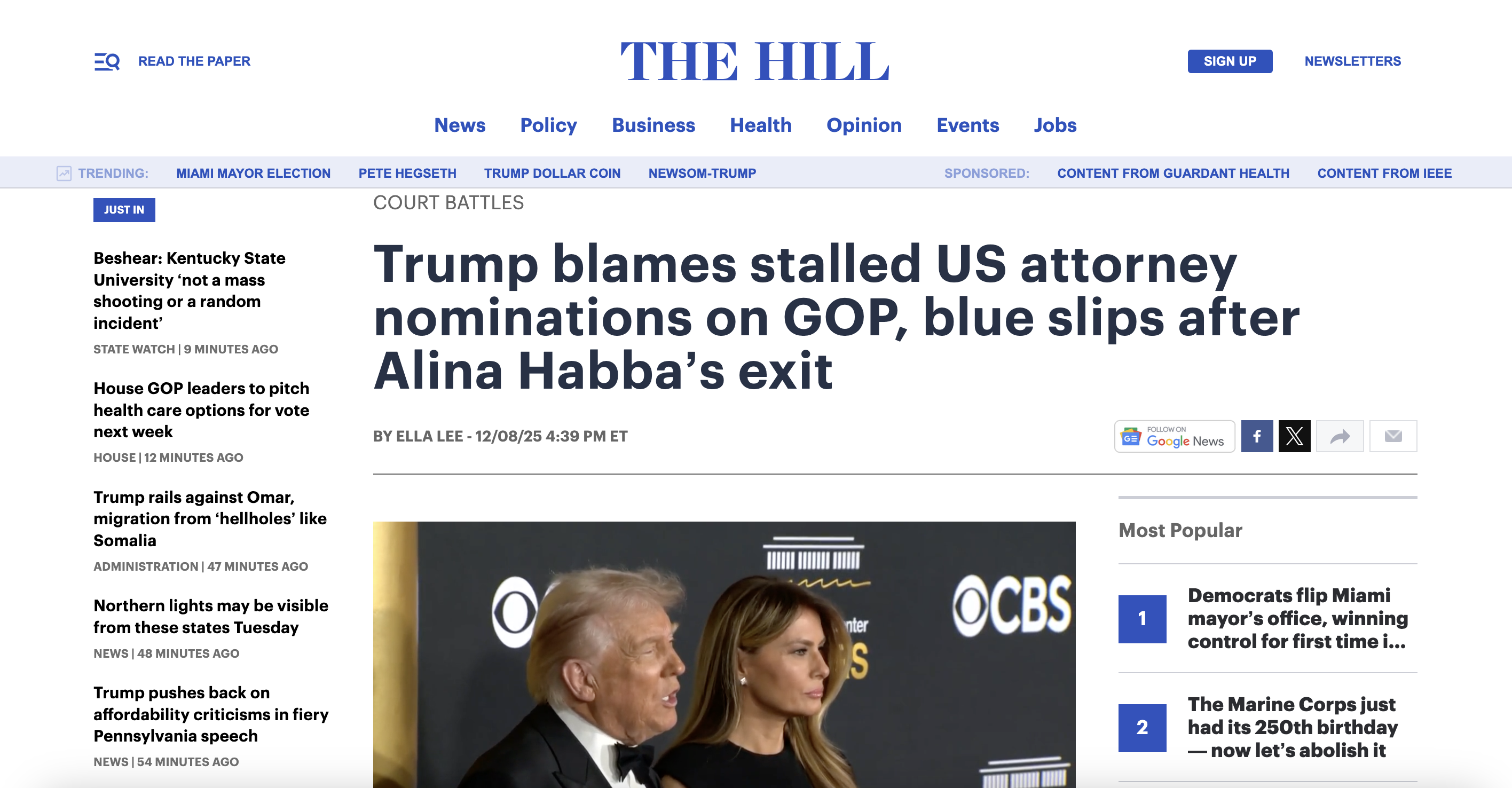 [112]Trump blames stalled US attorney nominations on GOP, blue slips after Alina Habba’s exit media link