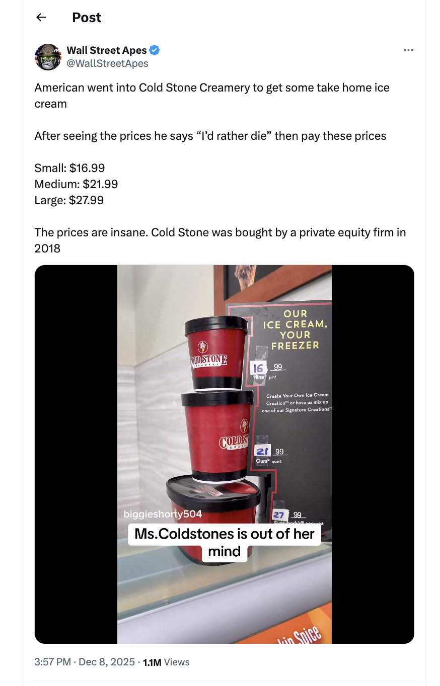 [109]American went into Cold Stone Creamery to get some take home ice cream. After seeing the prices he says “I’d rather die” then pay these prices media link