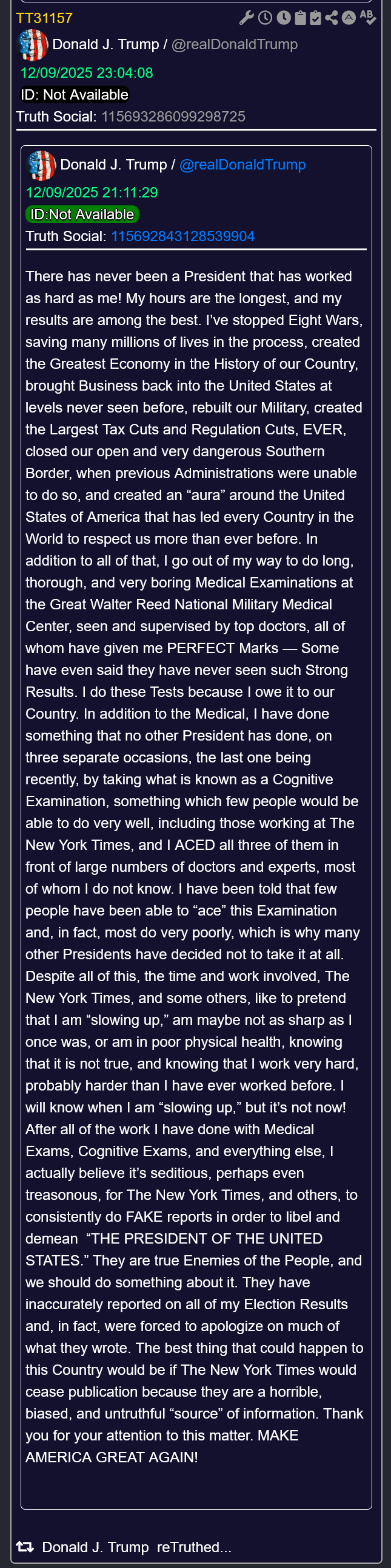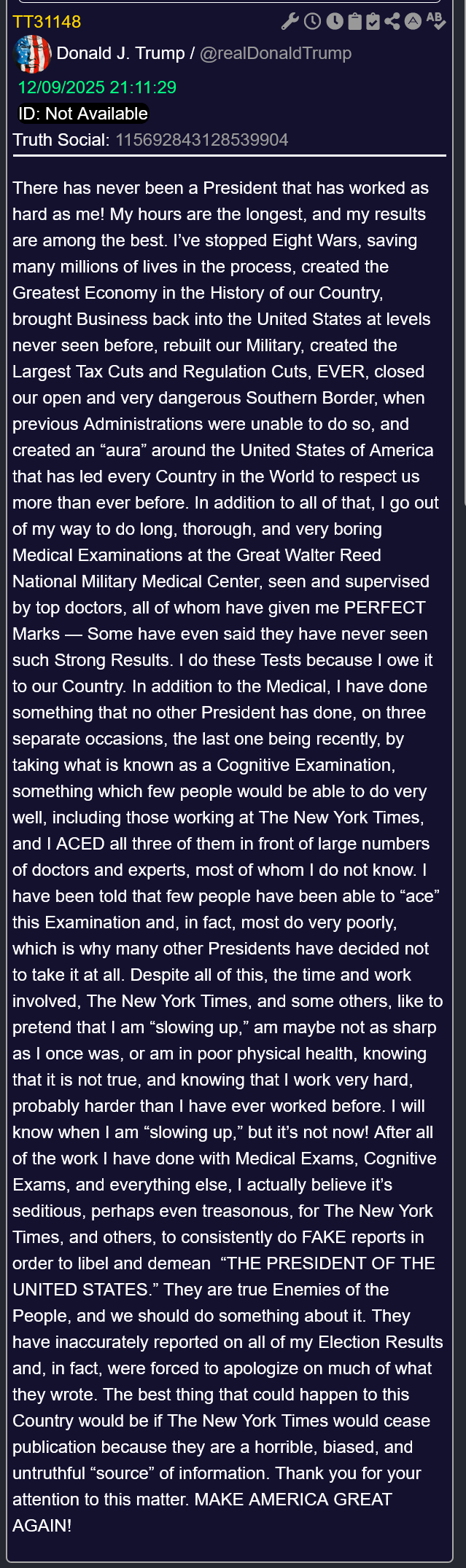 [108]There has never been a President that has worked as hard as me! My hours are the longest, and my results are among the best media link