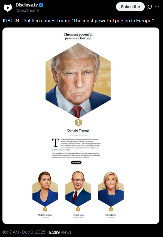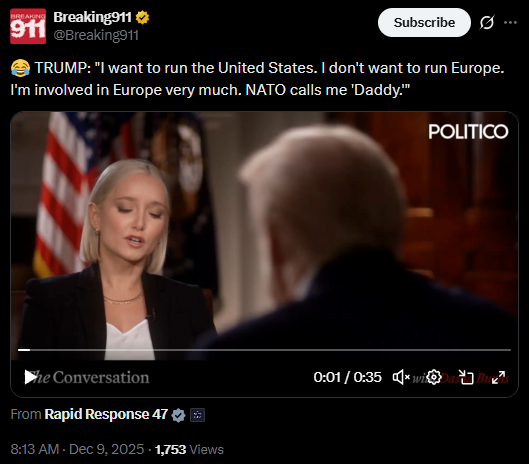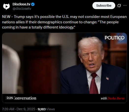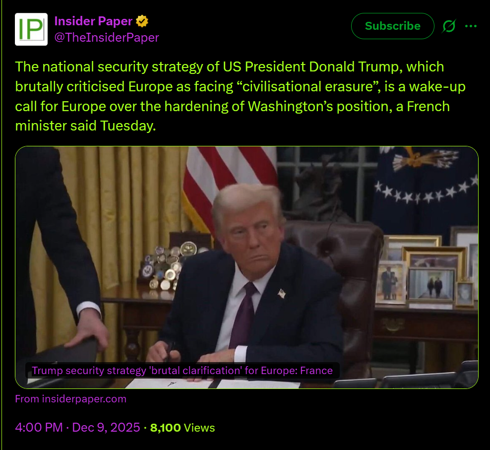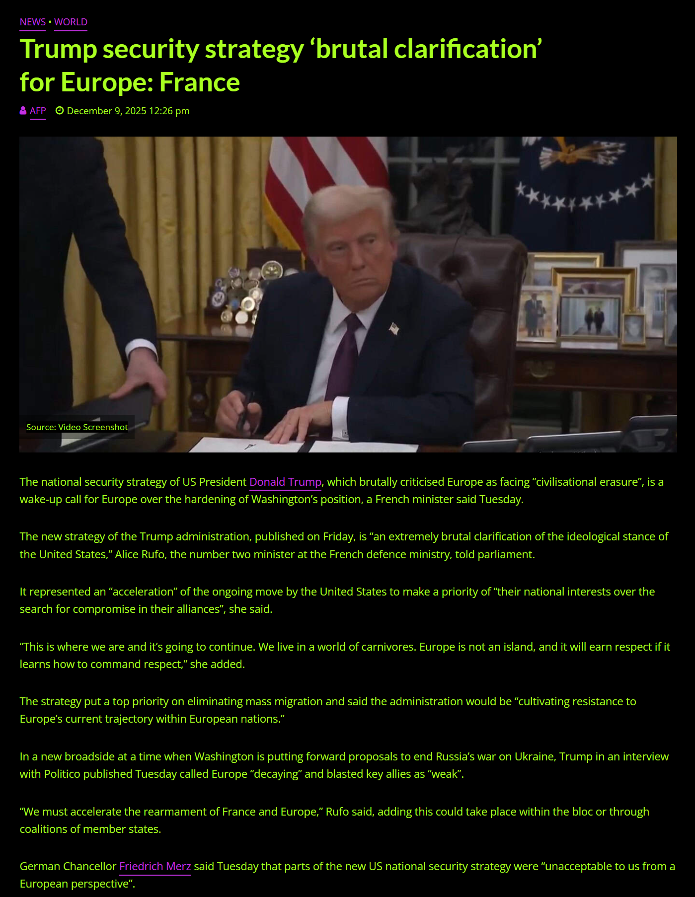 [106]The national security strategy of US President Donald Trump, which brutally criticised Europe as facing “civilisational erasure”, is a wake-up call for Europe over the hardening of Washington’s position, a French minister said Tuesday media link media link