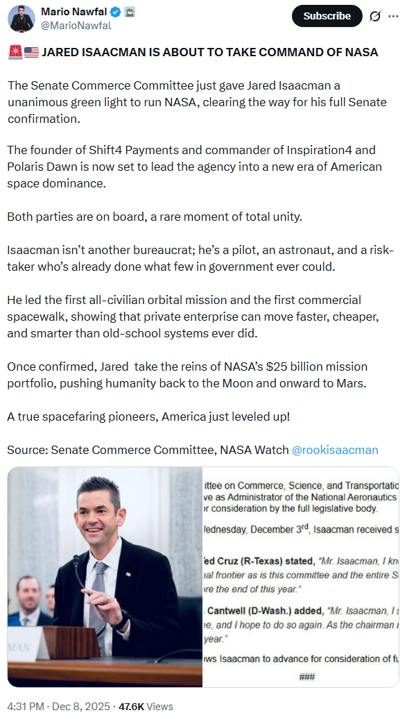 [023]US Senate committee advances renomination of Jared Isaacman as head of NASA media link media link media link