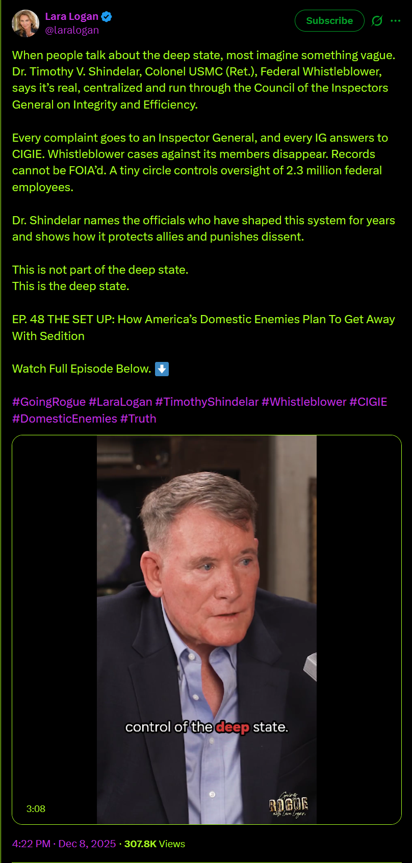 [113]When people talk about the deep state, most imagine something vague. Dr. Timothy V. Shindelar, Colonel USMC (Ret.), Federal Whistleblower, says it’s real, centralized and run through the Council of the Inspectors General on Integrity and Efficiency media link media link