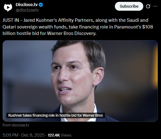 [003]Kushner's Affinity Partners, along with the Saudi and Qatari sovereign wealth funds, take financing role in Paramount's $108 billion hostile bid for Warner Bros Discovery media link