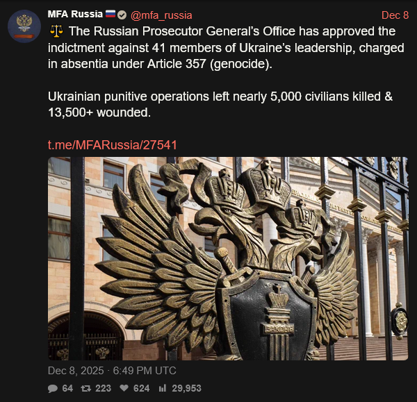 [085]Russia approves Indictment against 41 members of Ukraine’s leadership, charged in absentia under Article 357 (genocide) media link media link media link