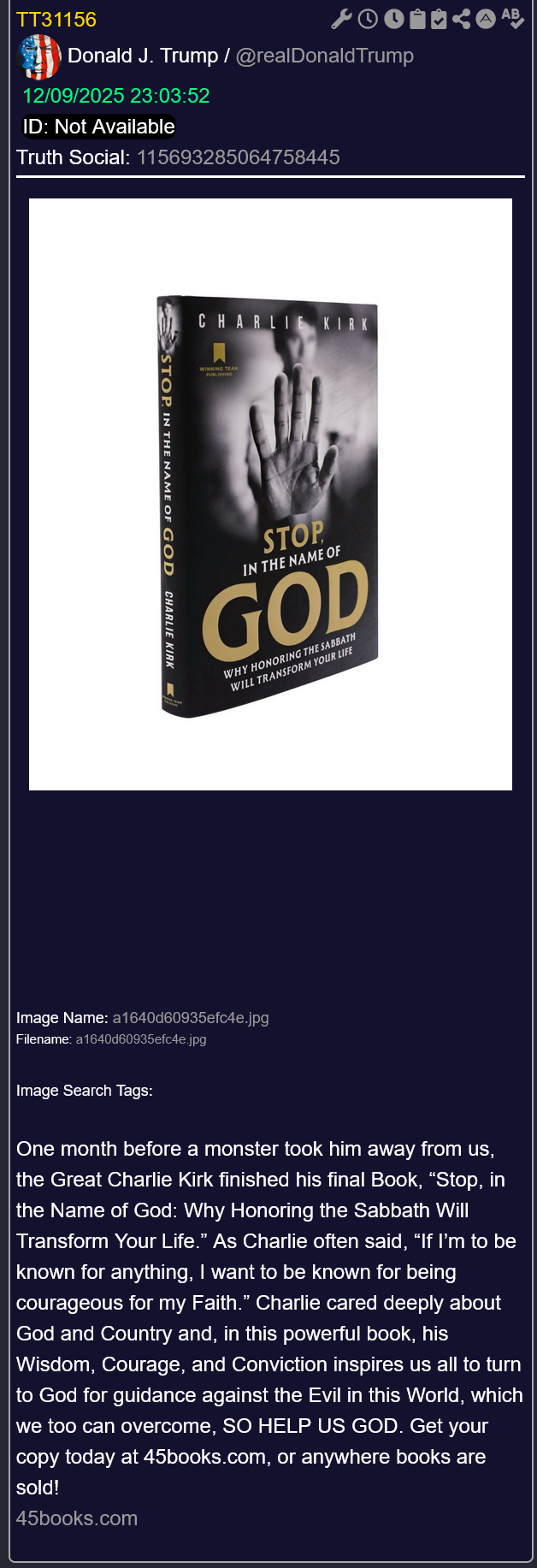 [107]One month before a monster took him away from us, the Great Charlie Kirk finished his final Book, “Stop, in the Name of God: Why Honoring the Sabbath Will Transform Your Life.” media link