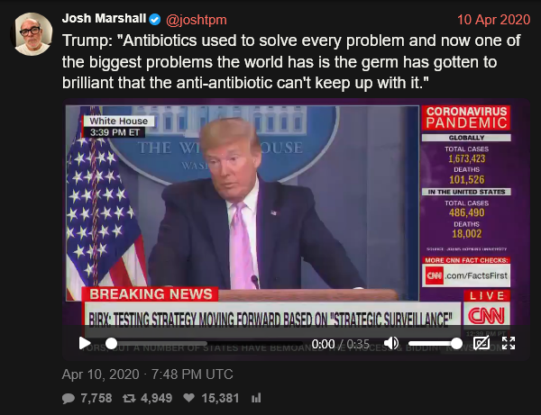 [058]4 10 20 "the germ has gotten so brilliant that the anti-antibiotic can't keep up with it." media link