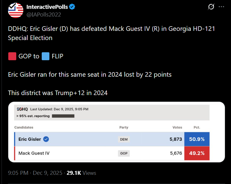 [099]DDHQ: Eric Gisler (D) has defeated Mack Guest IV (R) in Georgia HD-121 Special Election media link