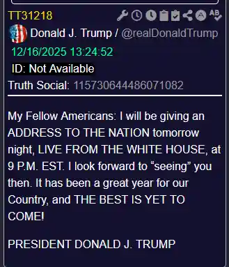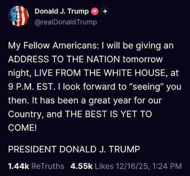 [043]@realDonaldTrump My Fellow Americans: I will be giving an ADDRESS TO THE NATION tomorrow night, LIVE FROM THE WHITE HOUSE, at 9 P.M. EST
