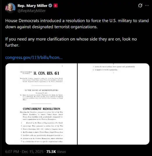 [025]11/17/25 Resolution to force the U.S. military to stand down against designated terrorist organizations media link