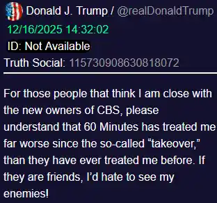 [052]@realDonaldTrump For those people that think I am close with the new owners of CBS, please understand that 60 Minutes has treated me far worse since the so-called “takeover” media link