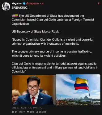 [058]US Department of State has designated the Colombian-based Clan del Golfo cartel as a Foreign Terrorist Organization media link