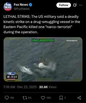 [005]Deadly kinetic strike on a drug-smuggling vessel in the Eastern Pacific killed one "narco-terrorist" media link