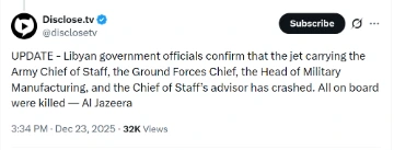 [035]Libya's Army Chief of Staff, Ground Forces Chief, Head of Military Manufacturing & Chief of Staff’s advisor all killed in plane crash media link