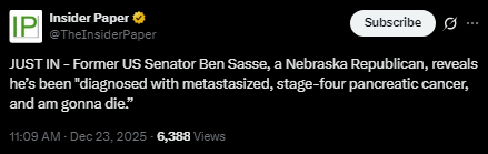 [029]Ben Sasse, Nebraska Republican, reveals he’s been "diagnosed with metastasized, stage-four pancreatic cancer, and am gonna die.” media link