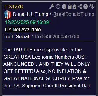 [016]@realDonaldTrump Q3 GDP came in at 4.3%, BLOWING PAST expectations of 3.2%. 60 of 61 Bloomberg Economists got it WRONG, but “TRUMP,” and some other Geniuses, got it right. TARIFFS!