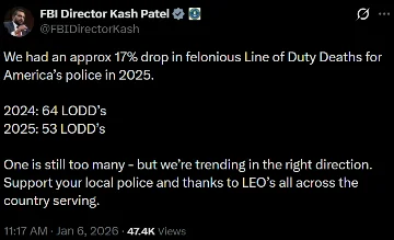 [022]@FBIDirectorKash We had an approx 17% drop in felonious Line of Duty Deaths for America’s police in 2025 media link