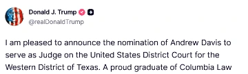 [066]@realDonaldTrump I am pleased to announce the nomination of Andrew Davis to serve as Judge on the United States District Court for the Western District of Texas media link
