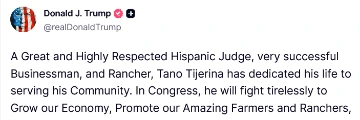 [054]@realDonaldTrump A Great and Highly Respected Hispanic Judge Tano Tijerina... has my Complete and Total Endorsement to be the next Representative from Texas’ 28th Congressional District media link