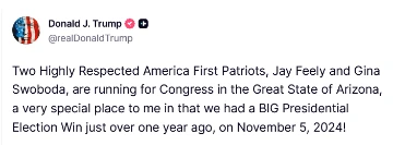 [051]@realDonaldTrump Two Highly Respected America First Patriots, Jay Feely and Gina Swoboda, are running for Congress in the Great State of Arizona media link