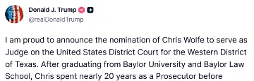 [067]@realDonaldTrump I am proud to announce the nomination of Chris Wolfe to serve as Judge on the United States District Court for the Western District of Texas media link