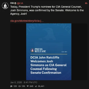 [099]President Trump's nominee for CIA General Counsel, Josh Simmons, was confirmed by the Senate. Welcome to the Agency, Josh! media link media link media link