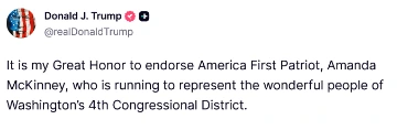 [052]@realDonaldTrump It is my Great Honor to endorse America First Patriot, Amanda McKinney, who is running to represent the wonderful people of Washington’s 4th Congressional District media link
