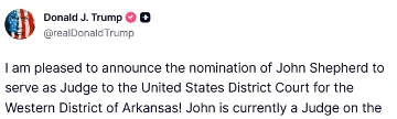 [068]@realDonaldTrump I am pleased to announce the nomination of John Shepherd to serve as Judge to the United States District Court for the Western District of Arkansas! media link