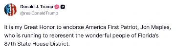 [062]@realDonaldTrump It is my Great Honor to endorse America First Patriot, Jon Maples, who is running to represent the wonderful people of Florida’s 87th State House District media link