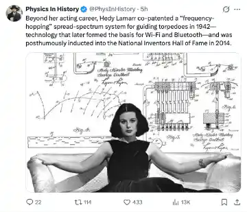 [030]Hedy Lamarr co-patented a “frequency-hopping” spread-spectrum system for guiding torpedoes in 1942 media link