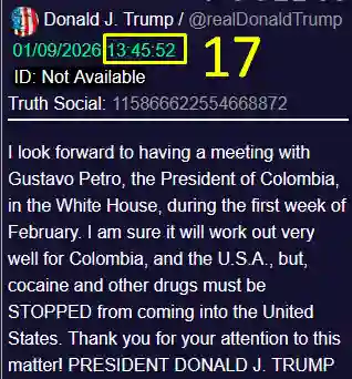 [017]@realDonaldTrump I look forward to having a meeting with Gustavo Petro, the President of Colombia, in the White House, during the first week of February media link