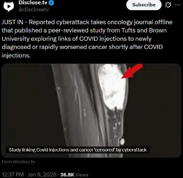 [012]Reported cyberattack takes oncology journal offline that published a peer-reviewed study from Tufts and Brown University exploring links of COVID injections to newly diagnosed or rapidly worsened cancer media link