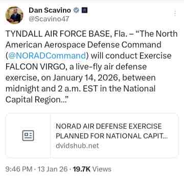 [092]Dan Scavino: TYNDALL AIR FORCE BASE, Fla. – “The North American Aerospace Defense Command (@NORADCommand) will conduct Exercise FALCON VIRGO, a live-fly air defense exercise, on January 14, 2026, between midnight and 2 a.m. EST in the National Capital Region…” media link media link