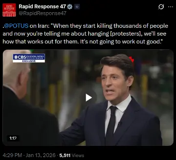 [041]@POTUS on Iran: "When they start killing thousands of people and now you're telling me about hanging [protesters], we'll see how that works out for them. It's not going to work out good." media link media link