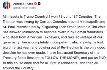 [042]@realDonaldTrump Minnesota is Trump Country! I won 78 out of 87 Counties. The Election was swung by Corrupt Counties around Minneapolis and St. Paul, represented by disgusting Ilhan Omar media link