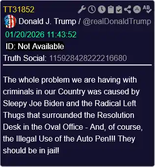 [009]@realDonaldTrump The whole problem we are having with criminals in our Country was caused by Sleepy Joe Biden and the Radical Left Thugs that surrounded the Resolution Desk in the Oval Office - And, of course, the Illegal Use of the Auto Pen!!! They should be in jail! [Resolute <> Resolution]