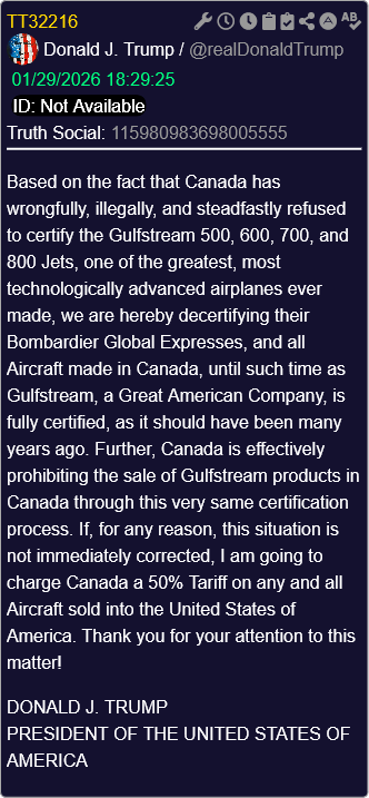 [064]@realDonaldTrump Based on the fact that Canada has wrongfully, illegally, and steadfastly refused to certify the Gulfstream 500, 600, 700, and 800 Jets, one of the greatest, most technologically advanced airplanes ever made, we are hereby decertifying their Bombardier Global Expresses, and all Aircraft made in Canada, until such time as Gulfstream, a Great American Company, is fully certified