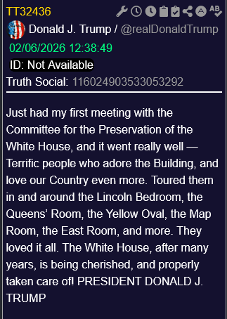 [012]@realDonaldTrump Just had my first meeting with the Committee for the Preservation of the White House, and it went really well — Terrific people who adore the Building, and love our Country even more. Toured them in and around the Lincoln Bedroom, the Queens’ Room, the Yellow Oval, the Map Room, the East Room, and more. They loved it all. The White House, after many years, is being cherished, and properly taken care of! PRESIDENT DONALD J. TRUMP