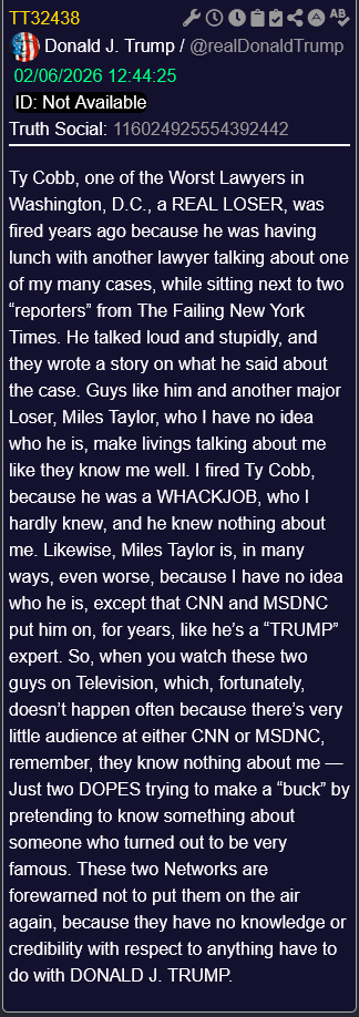 [016]@realDonaldTrump Ty Cobb, one of the Worst Lawyers in Washington, D.C., a REAL LOSER, was fired years ago because he was having lunch with another lawyer talking about one of my many cases, while sitting next to two “reporters” from The Failing New York Times. He talked loud and stupidly, and they wrote a story on what he said