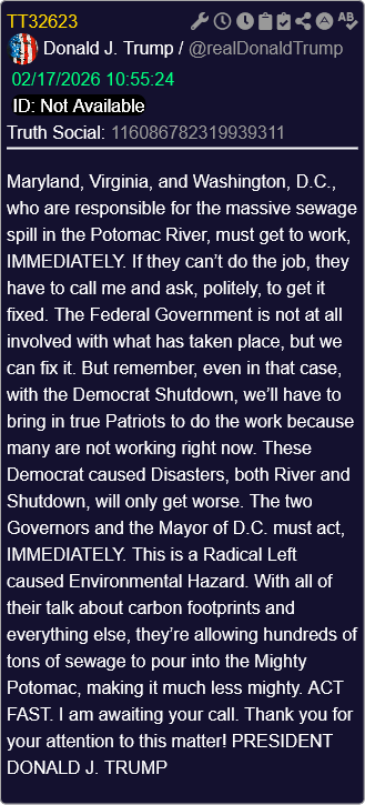 [036]@realDonaldTrump Maryland, Virginia, and Washington, D.C., who are responsible for the massive sewage spill in the Potomac River, must get to work, IMMEDIATELY. If they can’t do the job, they have to call me and ask, politely, to get it fixed. This is a Radical Left caused Environmental Hazard. I am awaiting your call