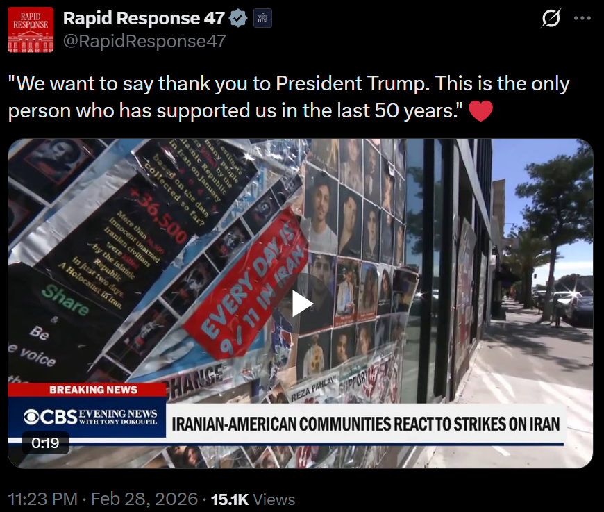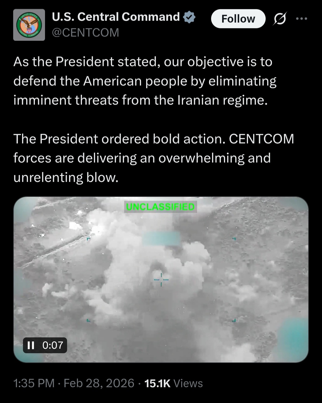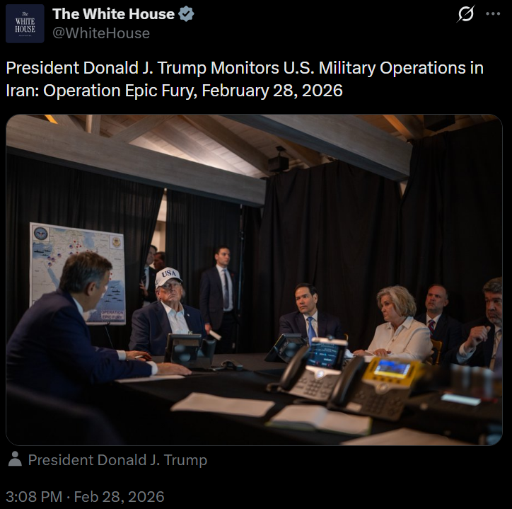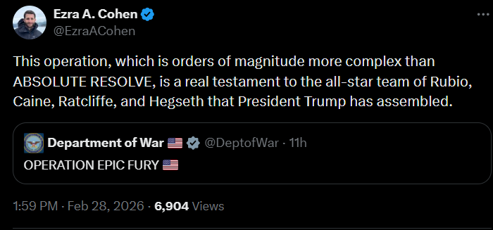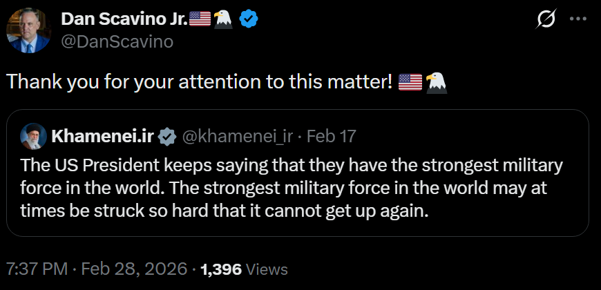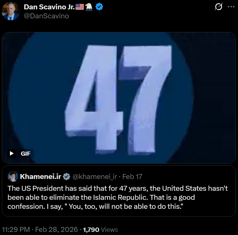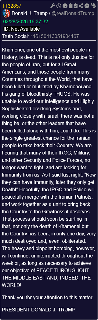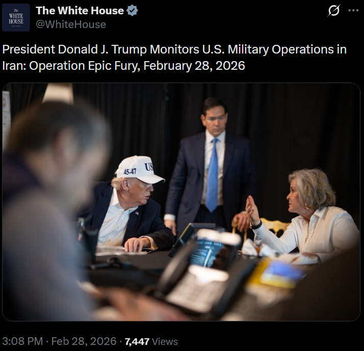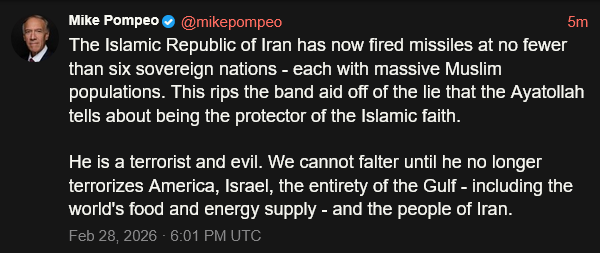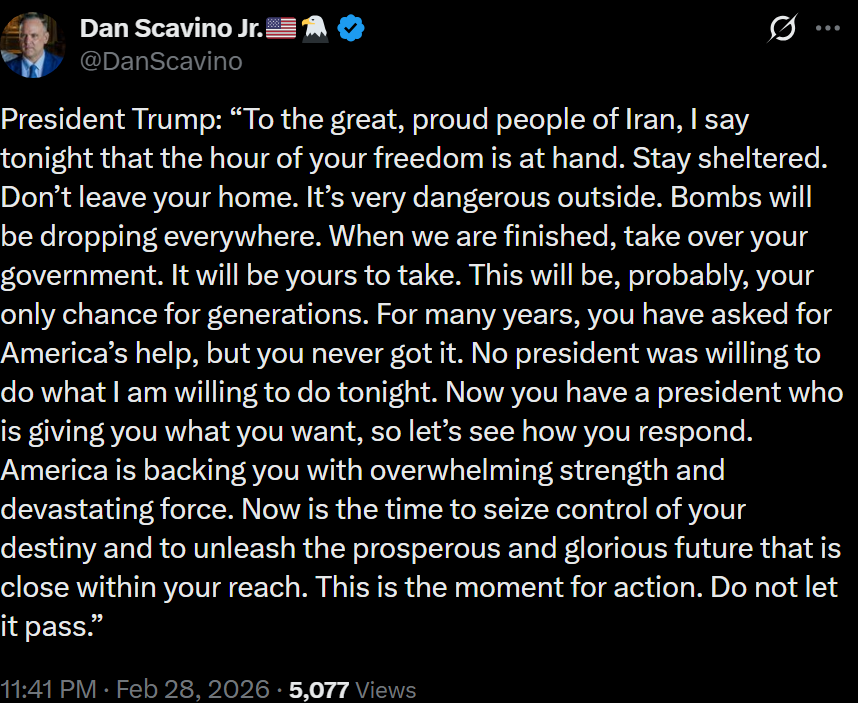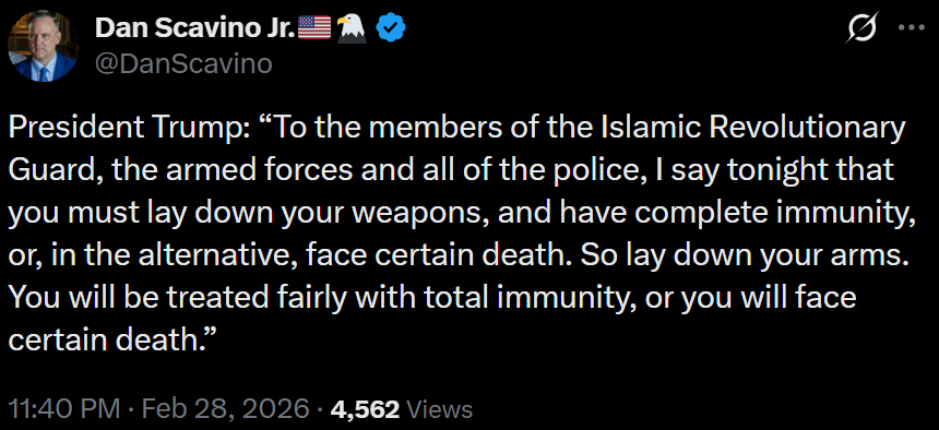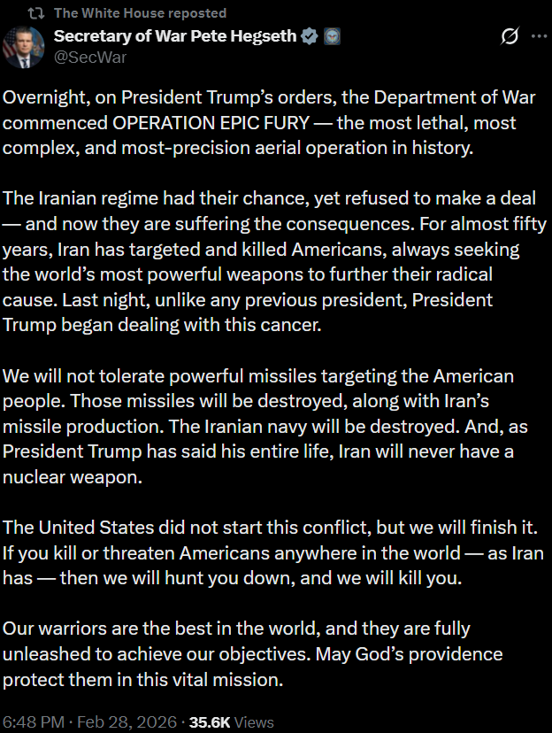[081]@SecWar The Iranian regime had their chance, yet refused to make a deal — and now they are suffering the consequences. For almost fifty years, Iran has targeted and killed Americans, always seeking the world’s most powerful weapons to further their radical cause. Last night, unlike any previous president, President Trump began dealing with this cancer