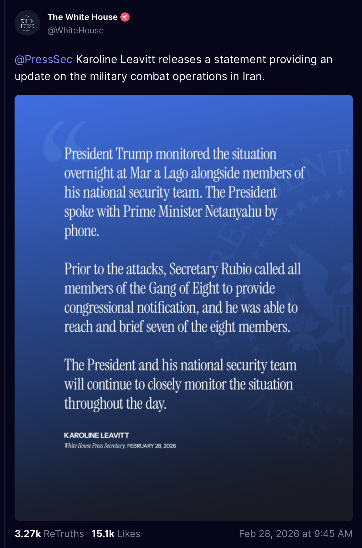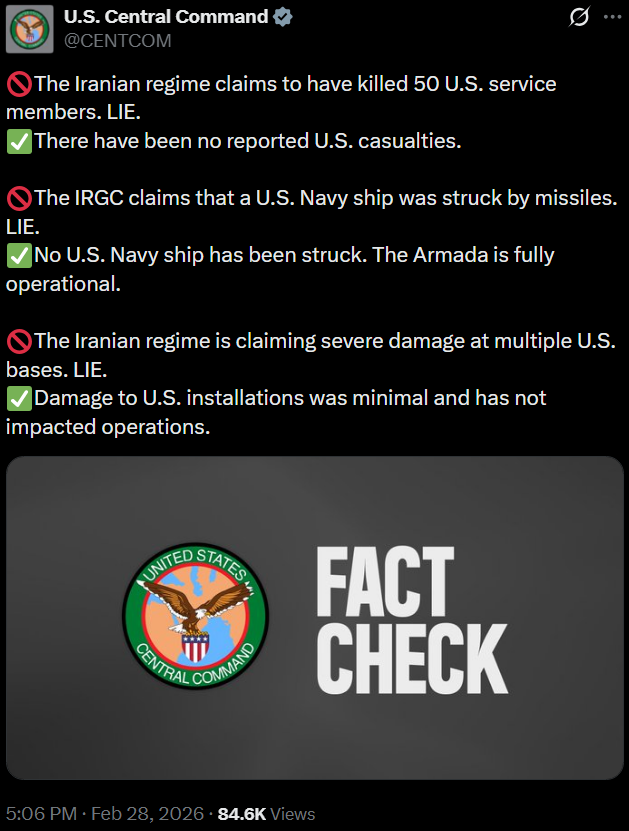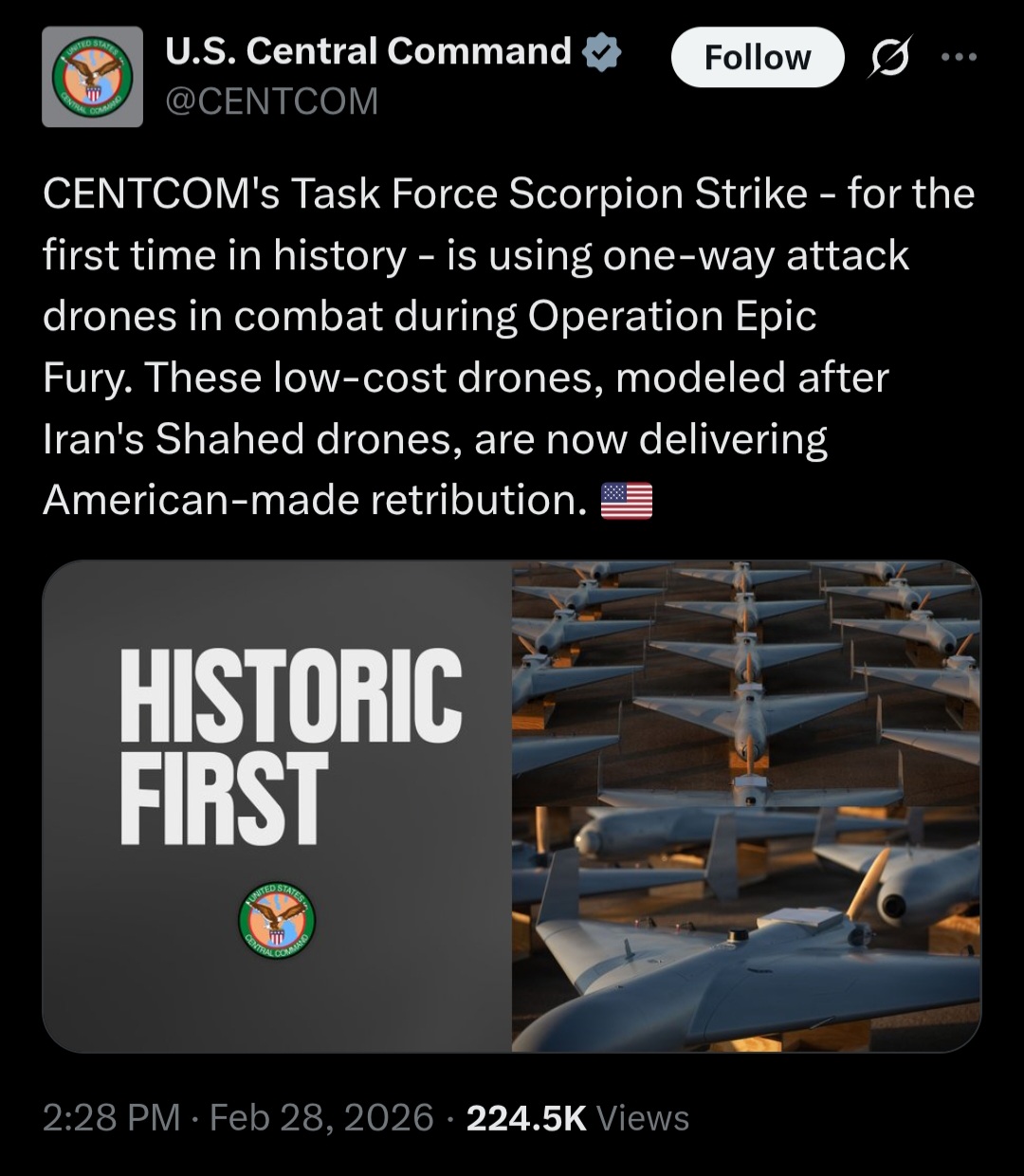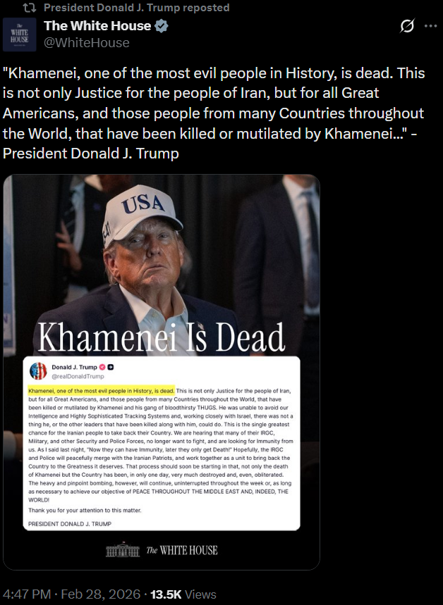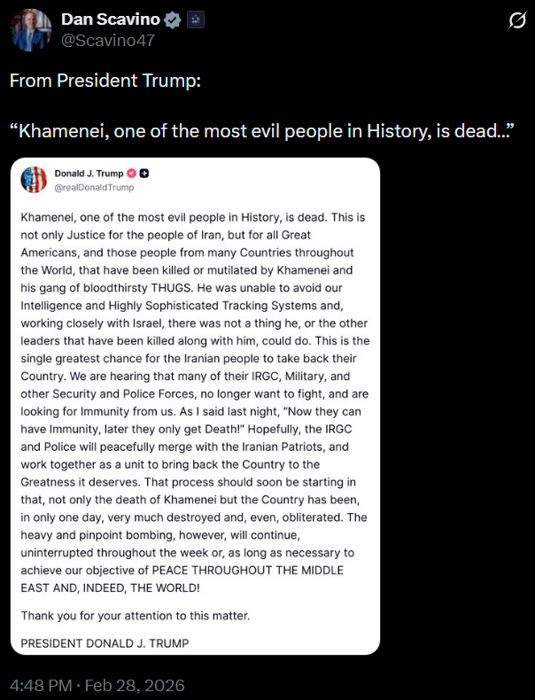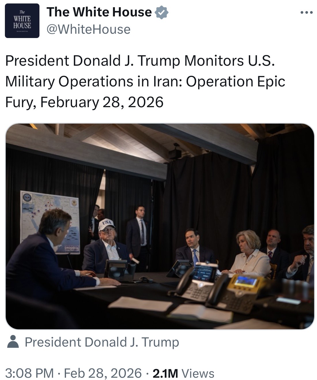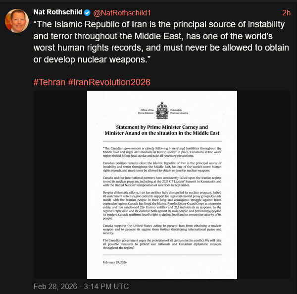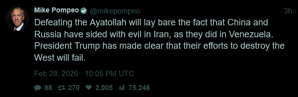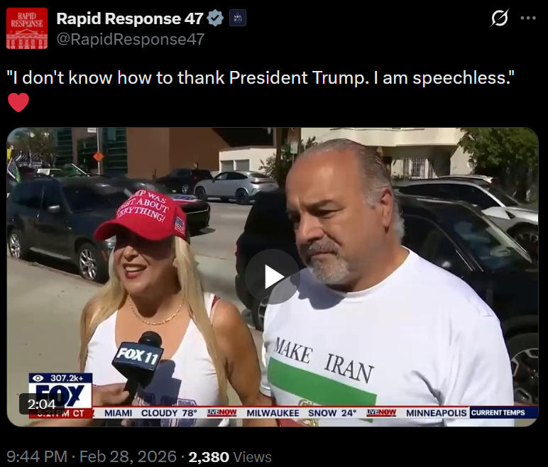 [081]@SecWar The Iranian regime had their chance, yet refused to make a deal — and now they are suffering the consequences. For almost fifty years, Iran has targeted and killed Americans, always seeking the world’s most powerful weapons to further their radical cause. Last night, unlike any previous president, President Trump began dealing with this cancer