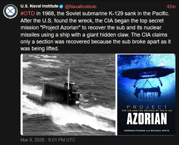 [070]#OTD 1968 the CIA began the top secret mission "Project Azorian" to recover the Soviet K-129 sub and its nuclear missiles media link
